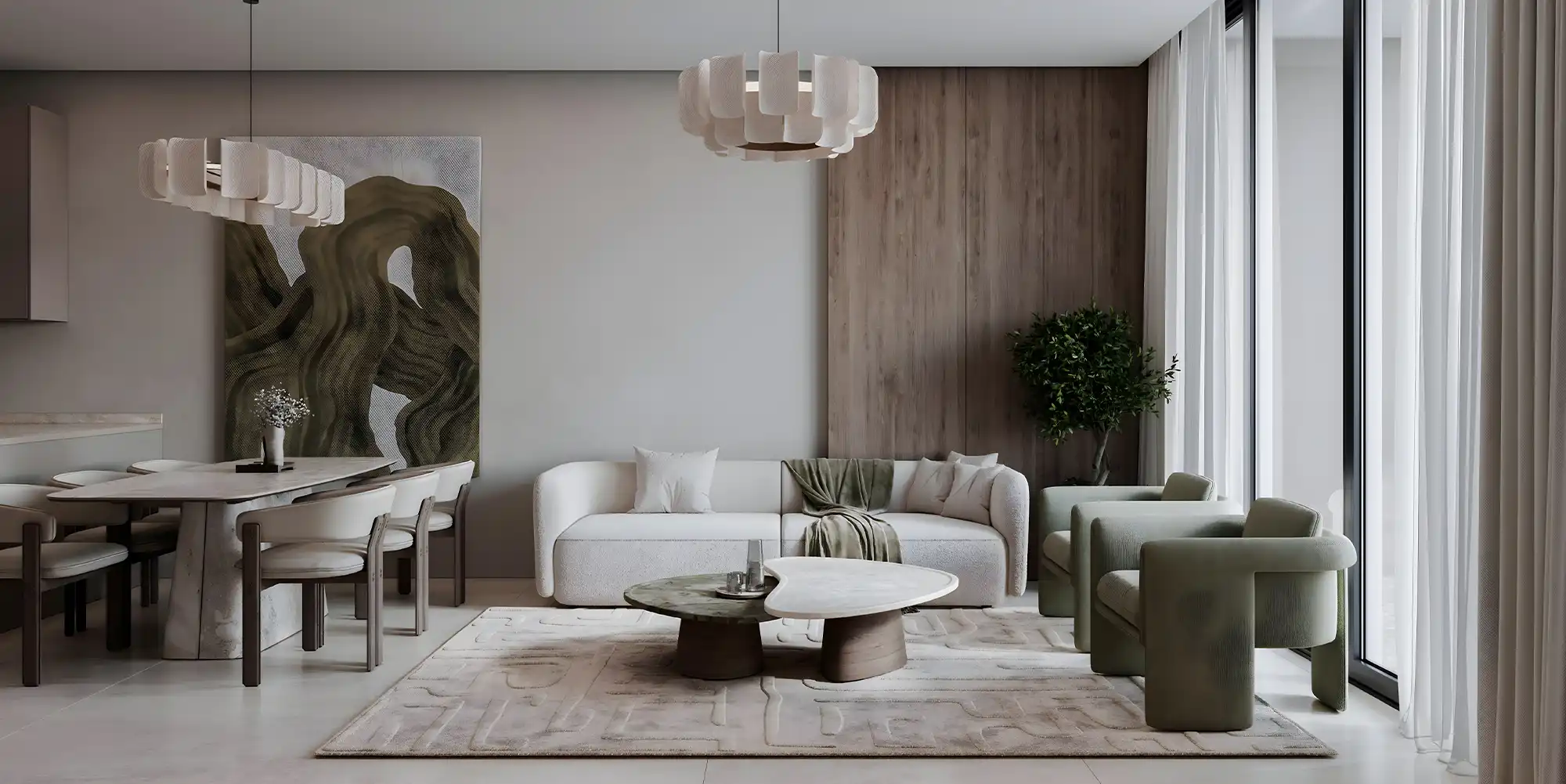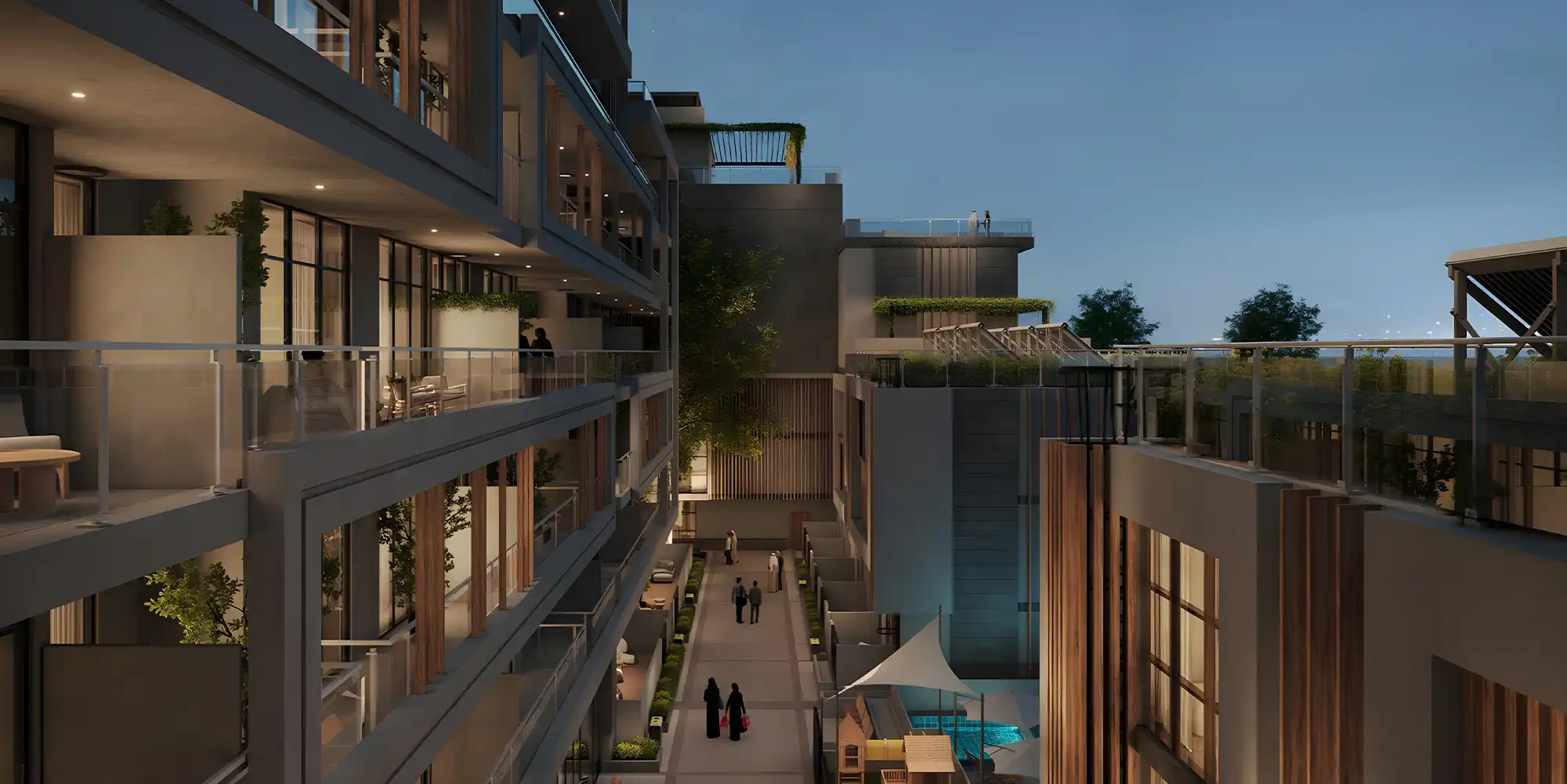 Green spaces, landscaped gardens, and children's play areas